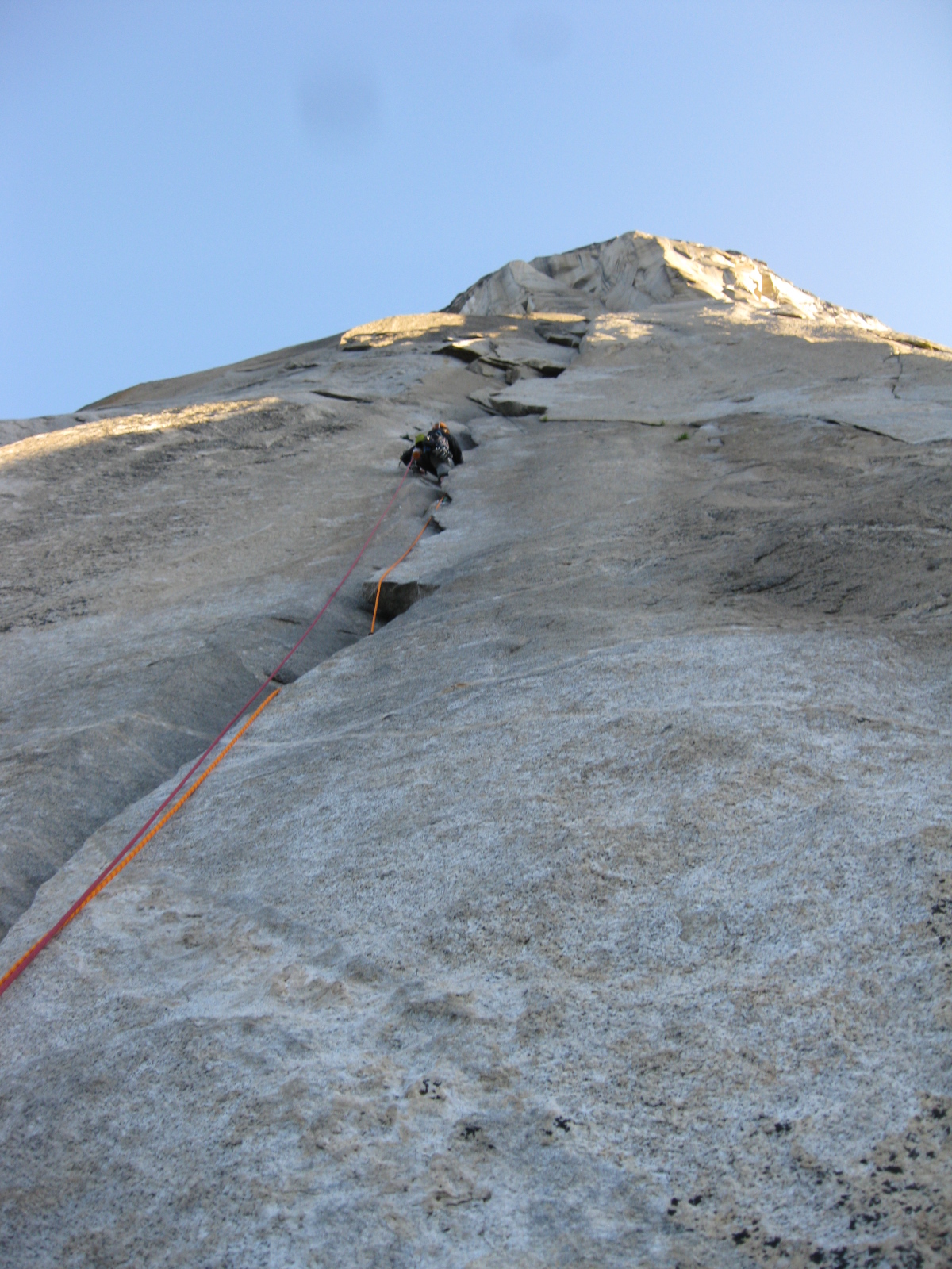 climbers blog. They are worth checking out. After they made it to the top we continued the rap down and got the the base of Moonlight as quick as we could. I took a peek at my watch right as I left the ground and it read 5:40PM. Well this is going to be exciting I thought and took off up the first pitch. I was able to make it most of the way up the first aid pitch before it got dark and then the rest was by headlamp. After 9 hrs of nonstop climbing I made it to the top. We were definitely feeling it and didn't wait around at the top for very long. We made our way to the road and eventually back to our tents for a 20 something hour day. SWEET!